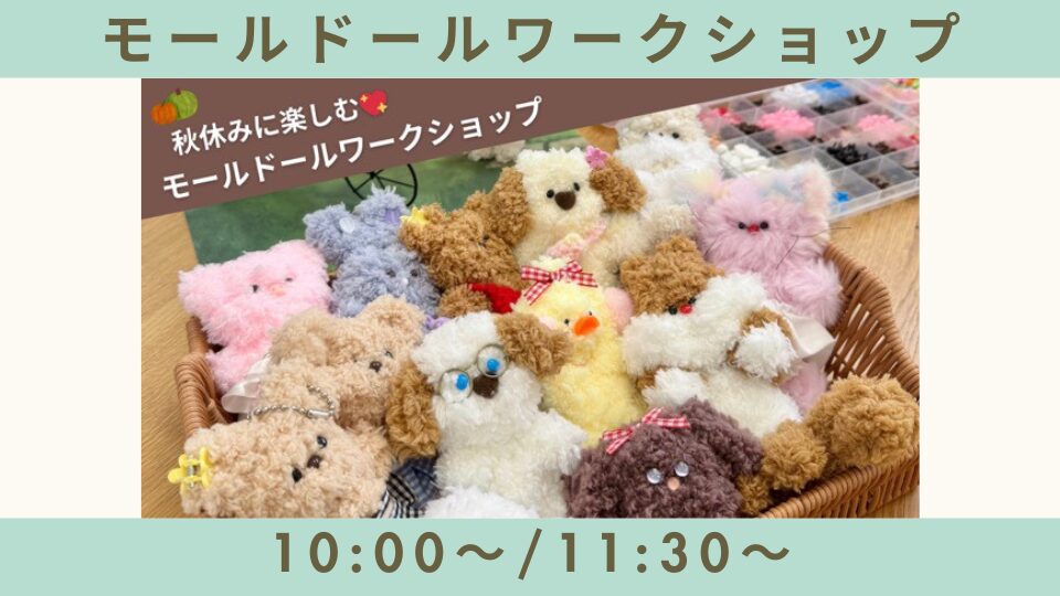 - 備考 ご予約は開催1週間前の10/3(金)にて締切とさせていただきます。 モールドールは資材の性質から、完成後も力を加えると変形します。 小さなパーツや接着剤を使用します。 ※特にお子様のご参加・ご使用については上記事項をご理解いただき、保護者様のご判断にてお願いいたします。