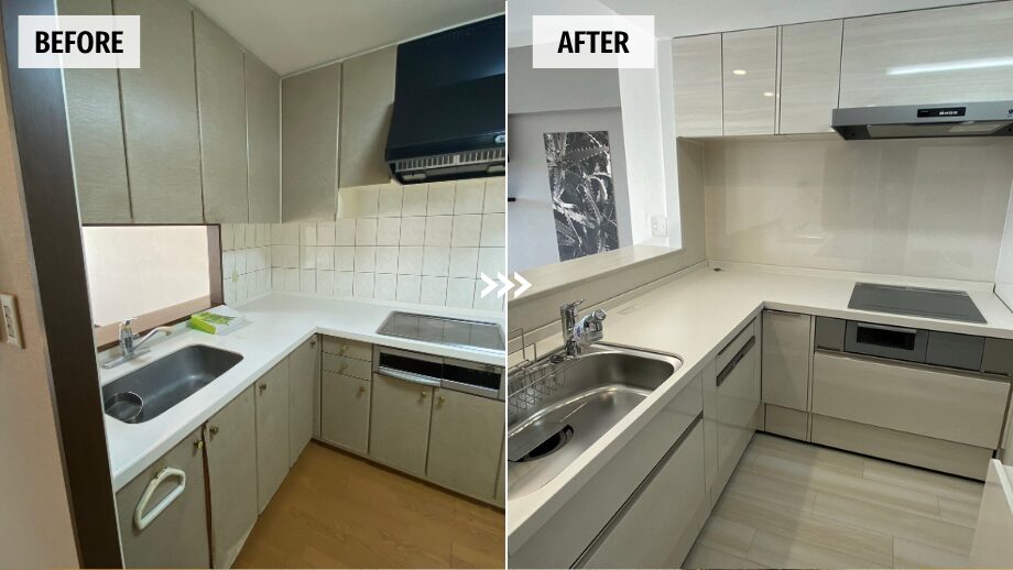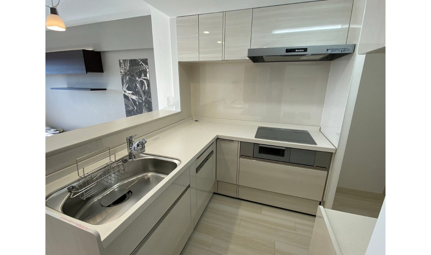L字はそのままで、シンク上の吊戸収納とキッチン入口横の壁を撤去しリビング・ダイニングとの一体感が増しました。